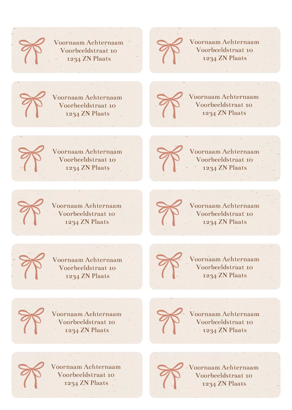 Adresstickers voor geboortekaartje met roze strikje op een beige achtergrond.