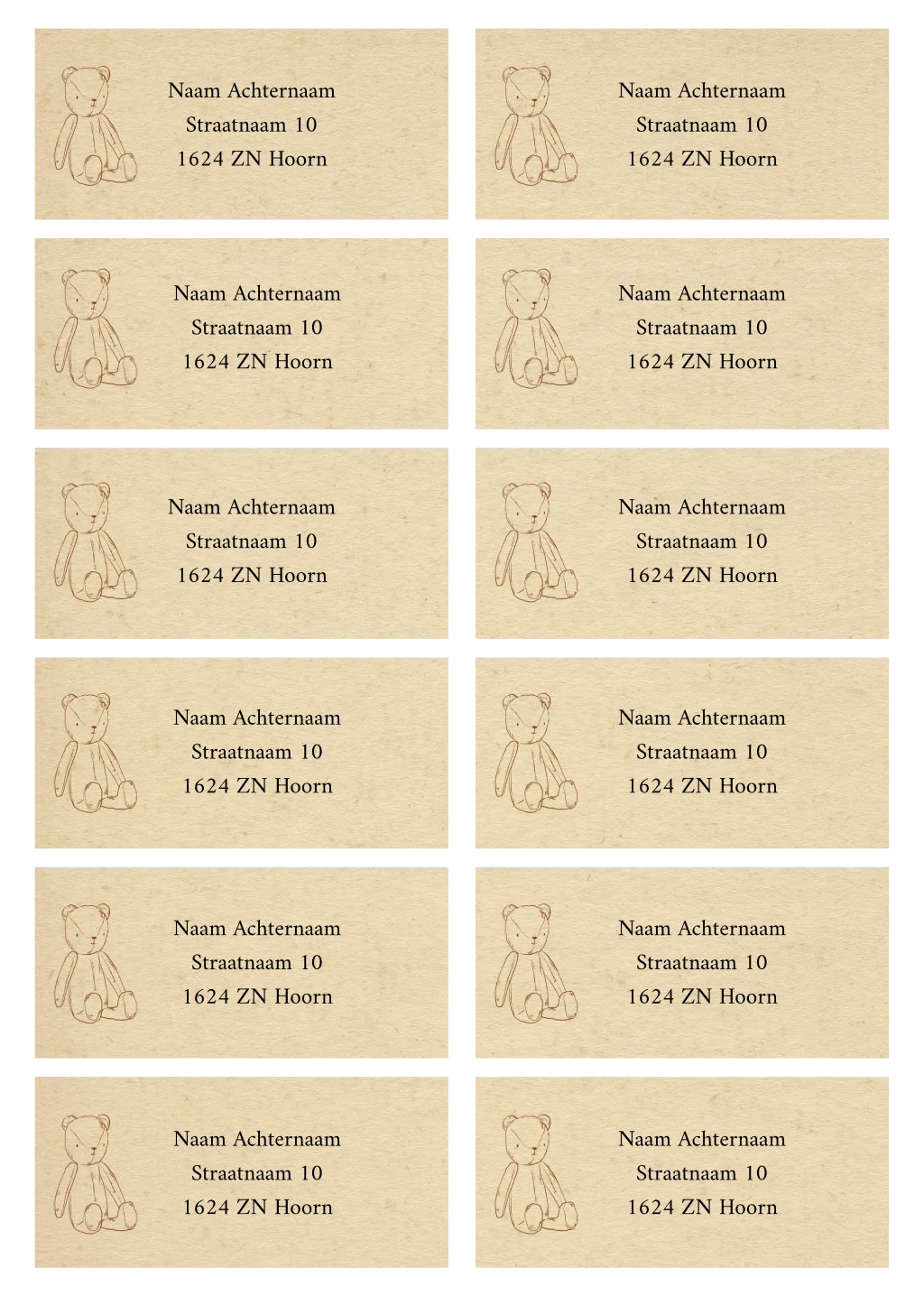 Maak je envelop persoonlijk met deze adressticker in vintage stijl met beertje. Bewerk eenvoudig in de editor. Je ontvangt 12 adresstickers per vel. Kies eerst hoeveel adresstickers je nodig hebt.