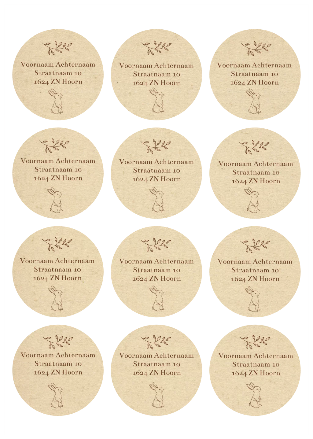 Bijzondere ronde adresstickers met een vezel-achtige beige achtergrond, een konijntje en een takje.