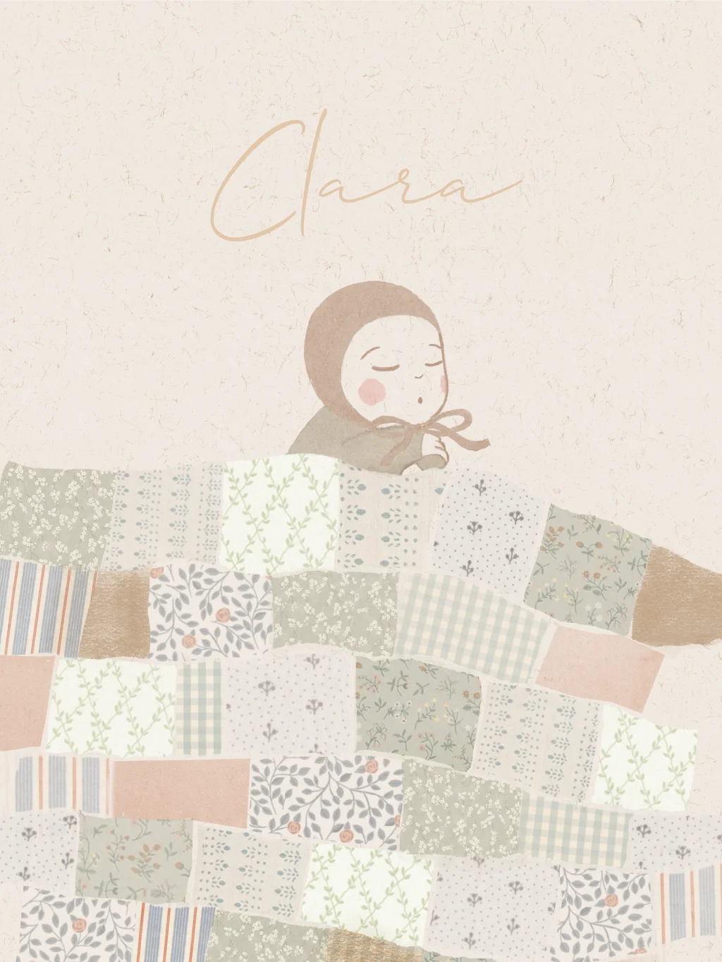 Een geboorteposter met lieve illustratie van een slapend kindje onder een lappendekentje. Heel mooi voor in de babykamer. Het is ook een optie om de geboortedatum toe te voegen. Ook ontzettend leuk als kraamcadeau.