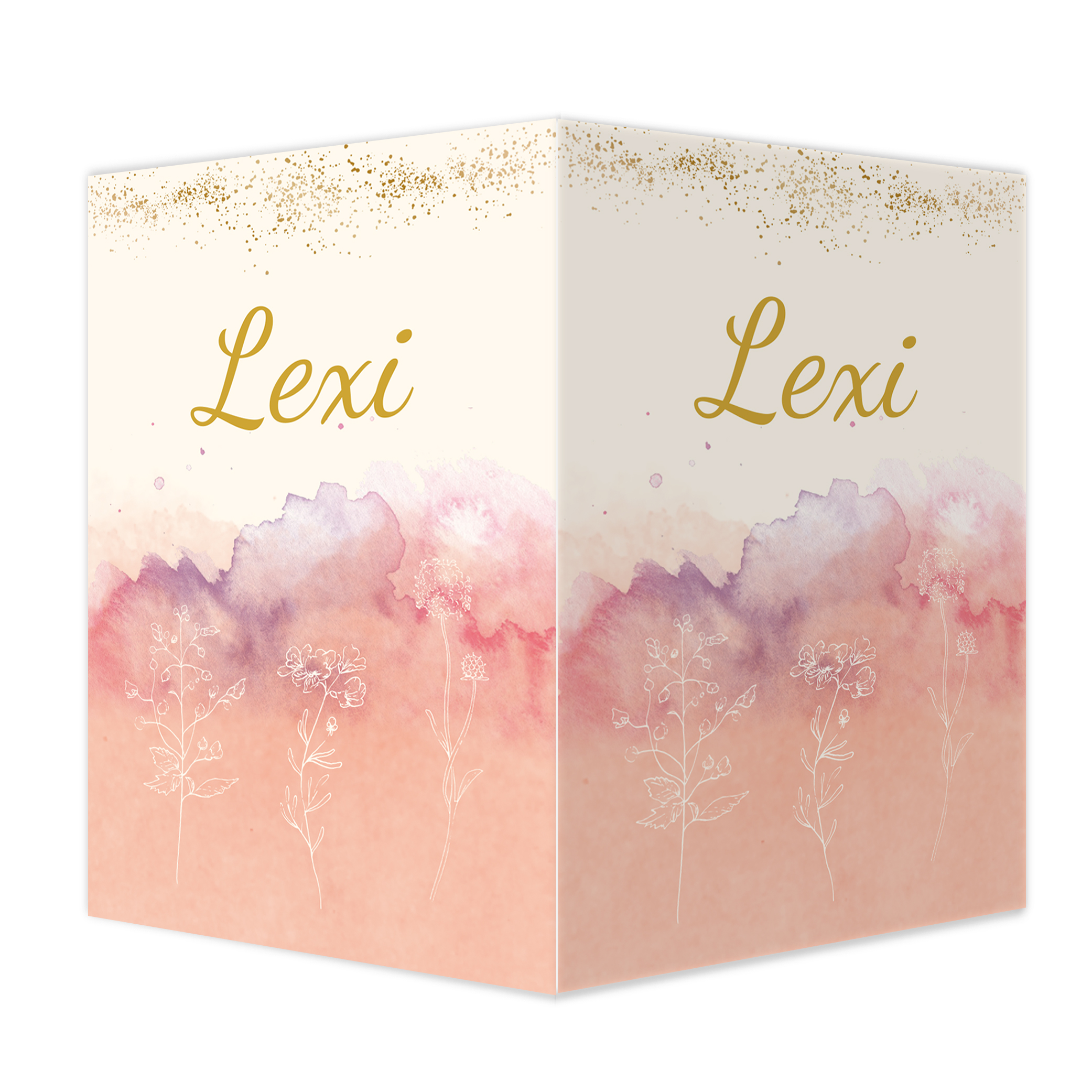 Prachtig geboorte raambord voor de geboorte van een meisje. Op dit romantische raambord met roze waterverf staat de naam afgebeeld, samen met subtiele wilde bloemen en goudkleurige spetters. Het geboorte raambord is geschikt om aan de buitenkant van het raam te bevestigen om zo iedereen te laten zien dat jullie dochter is geboren.