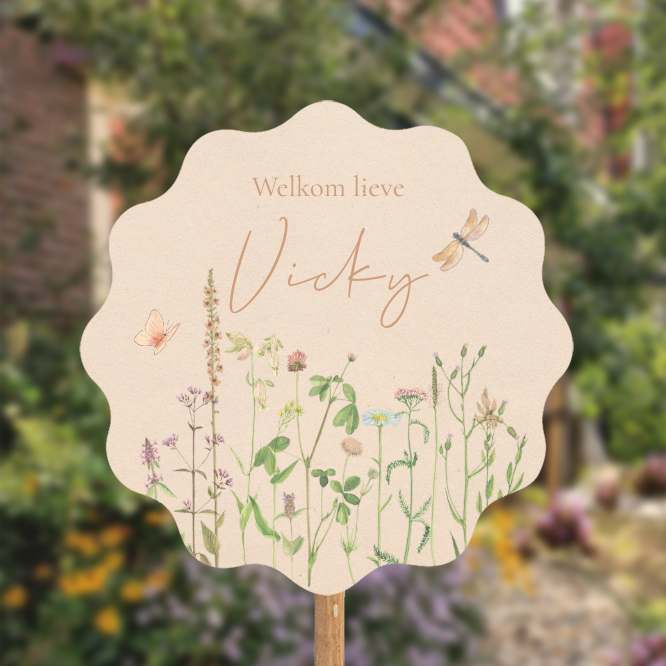 Maak de geboorte van jullie dochter bekend met een geboortebord voor in de tuin. Dit tuinbord heeft een mooie golvende ronde vorm (80 x 80 cm) met een illustratie van mooie wilde bloemen met een klein vlindertje en libelle. Bewerk het bord in de editor.