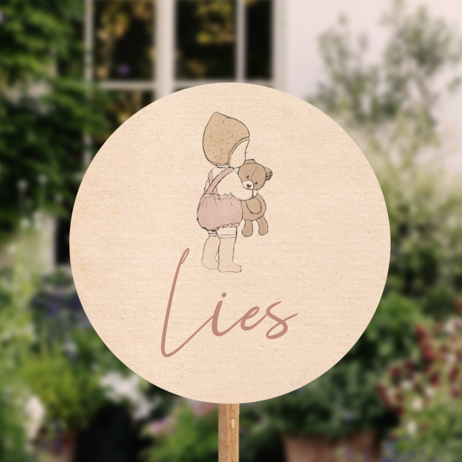 Een tuinbord met beer als geboorteaankondiging. Dit geboorte tuinbord is rond en heeft een super schattige illustratie van een meisje met een beertje. Bewerk het tuinbord gemakkelijk in de editor.