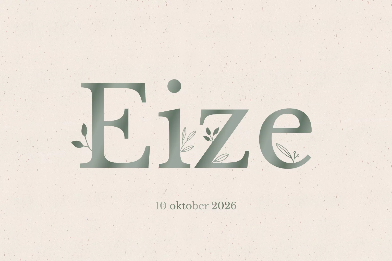 Stoer en minimalistisch geboortekaartje voor de geboorte van jullie zoontje. Op het kaartje staat in hoogglans de naam versierd met blaadjes in een donkergroene kleur.