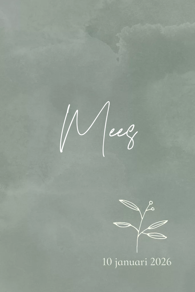 Mooi minimalistisch geboortekaartje voor een jongen in donkergroen met waterverf effect en goudfolie. Voeg zelf mooie strakke botanische elementen toe uit de beeldbank zodat je kaartje helemaal persoonlijk wordt. Zoetje helpt je graag bij het ontwerpen.