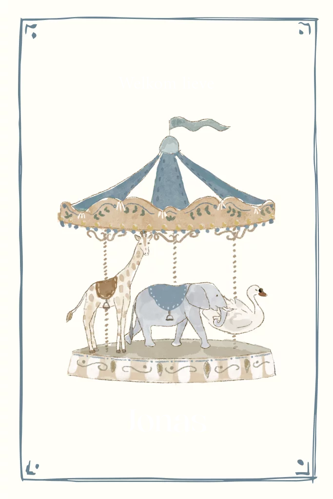 GEBOORTEKAARTJE MET DIEREN IN CARROUSEL JONGEN