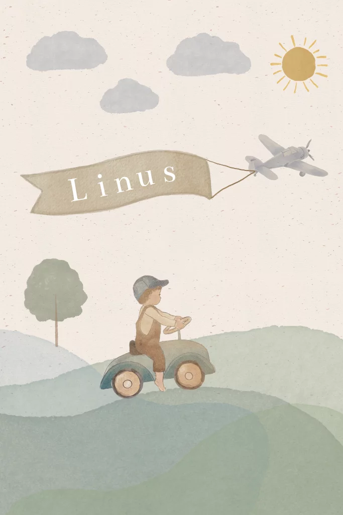 Een mooi geboortekaartje voor een zoon. Er zweeft een vliegtuigje boven het landschap met heuvels in blauwe kleuren. Plaats de naam van je kindje in de banner die achter het vliegtuig hangt.
