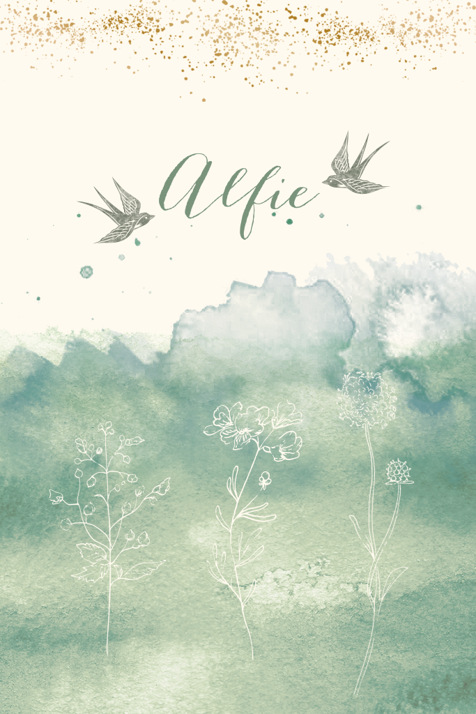 Een mooi watercolor geboortekaartje met botanische elementen, zwaluwen en goudspetters. Het kaartje kan je in de online editor volledig naar wens aanpassen. Bestel daarna snel een proefdruk om te kijken hoe dit kaartje er in het echt uitziet!
