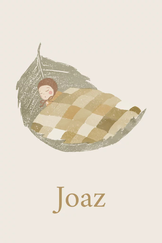 Heel schattig geboortekaartje van een slapend kindje in een blad. Het dekentje in stoere kleuren zoals groen, blauw en bruin maakt het kaartje uniek.