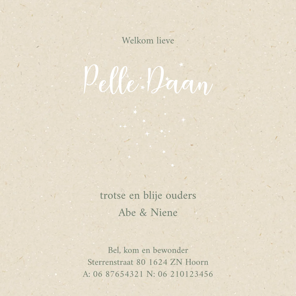 Bijzonder origineel babykaartje voor een jongen. Een unieke sterrenstand op basis van de geboortedatum, -plaats en -tijd. Heel mooi met foliedruk op een donkergroene achtergrond. Je kan alles zelf omkleuren. Bewaar je ontwerp en stuur een mailtje na de geboorte. Dan zet Zoetje de aangepaste sterrenhemel in jullie kaartje.