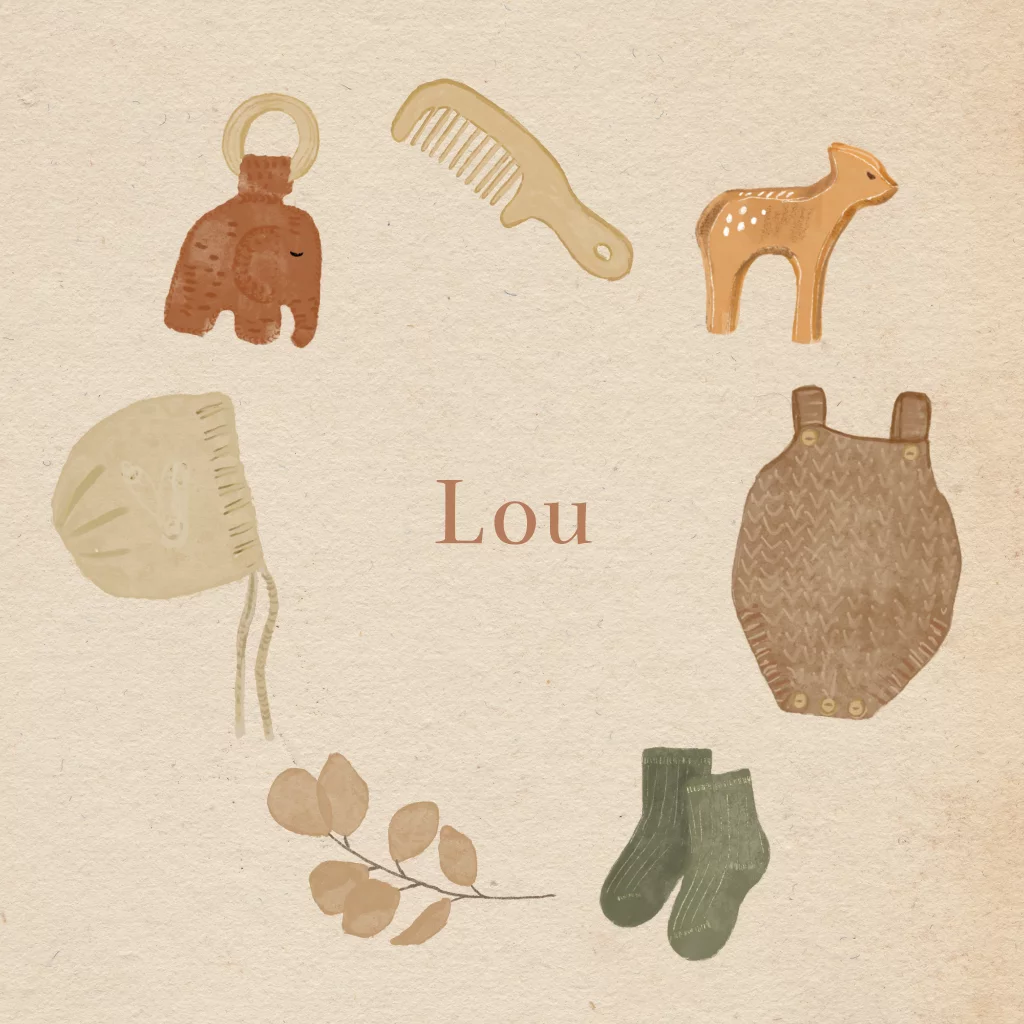 Hip jongens geboortekaartje met schattige illustraties van babyspulletjes, zoals een pakje, groene sokjes en een mutsje in aardetinten. Ook de plaatjes van het speelgoed in de vorm van een olifant en een hertje zijn ontzettend lief. Eenvoudig te personaliseren. Bestel een proefdruk om dit geboortekaartje voor jullie zoon in het echt te zien.