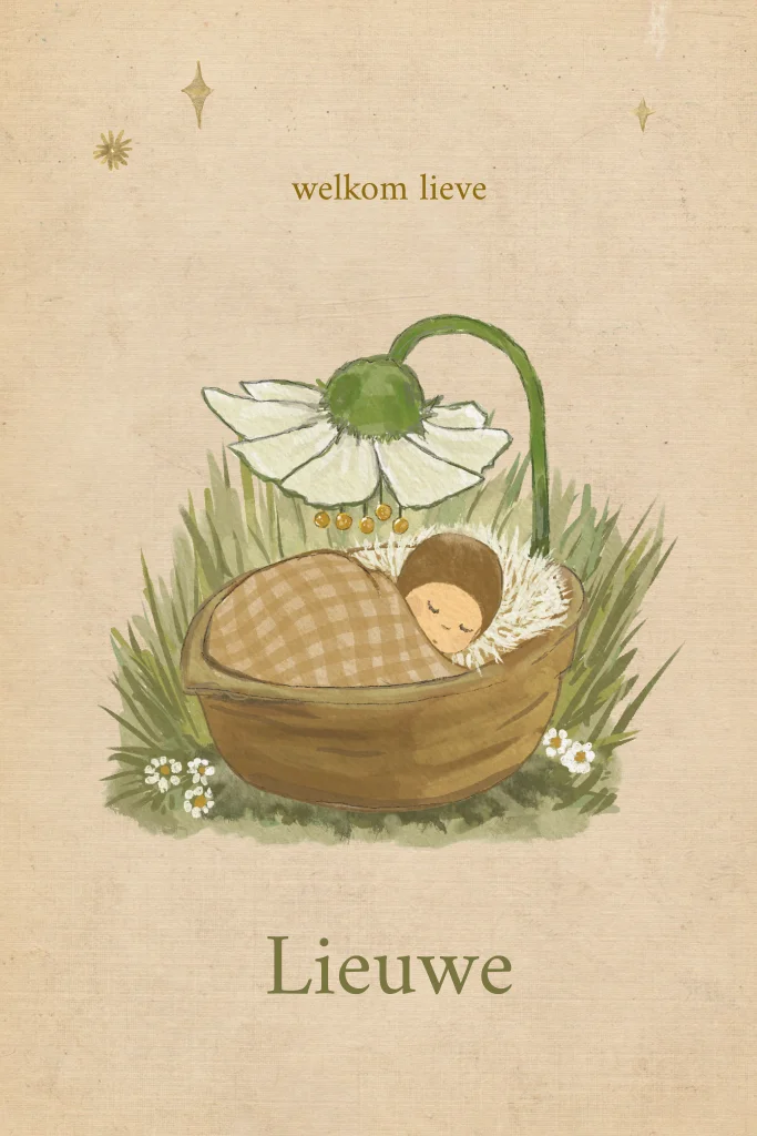 Een lief groen geboortekaartje met baby slapend in een notendopje onder bloem. Personaliseer het ontwerp in de online editor.