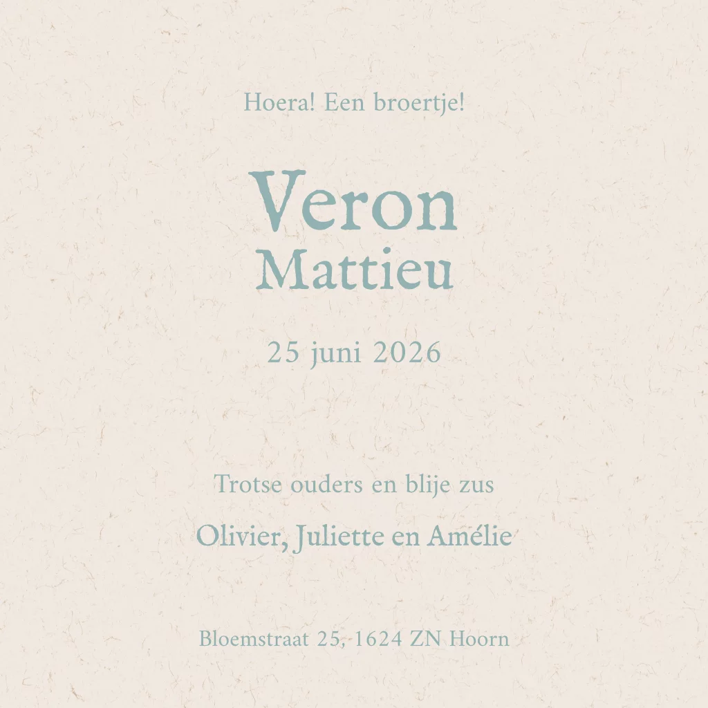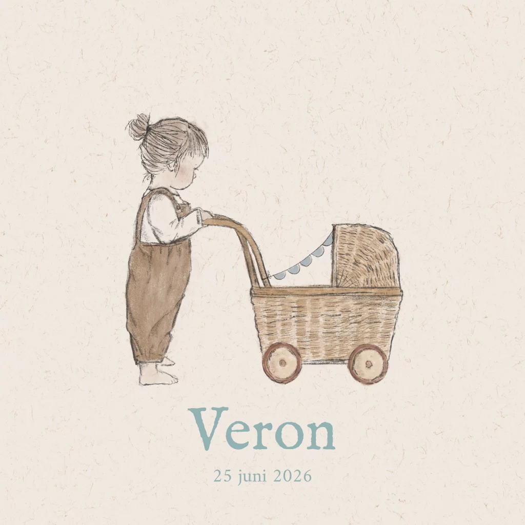 Lief geboortekaartje met illustratie van een grote zus die een poppenwagentje duwt. Het blauwe slingertje aan het poppenwagentje staat symbool voor het kleine broertje. Je kunt de illustraties aanpassen en vervangen door andere kindjes die je kunt vinden in de beeldbank. Zou je de illustratie willen laten aanpassen? Laat het Zoetje even weten, dan kijk ik graag met je mee.