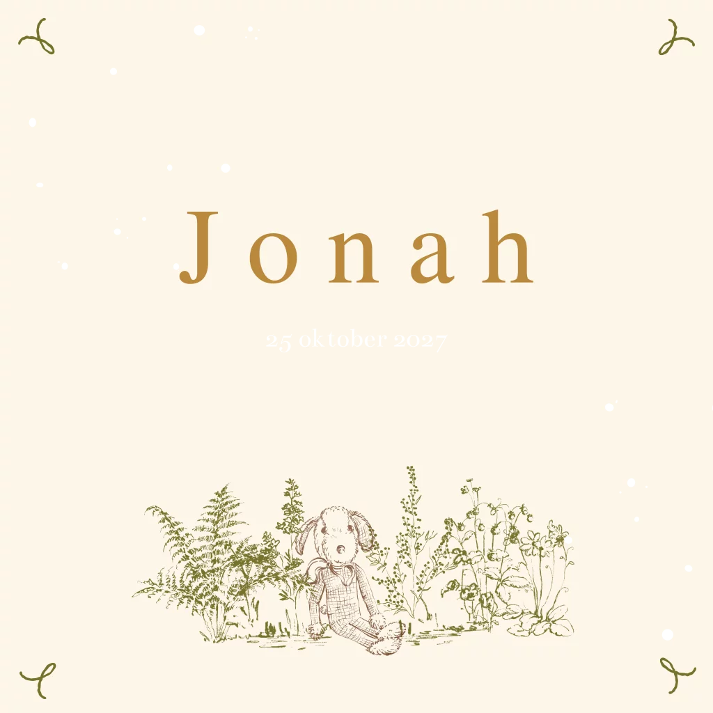Een vierkant geboortekaartje met illustratie van een knuffelhondje met oudgroene bloemen en planten. De goudfolie spetters op de voorzijde geven dit kaartje net dat beetje extra. Dit geboortekaartje voor een jongen is volledig aanpasbaar waardoor je de mogelijkheid hebt om het kaartje naar wens te bewerken.