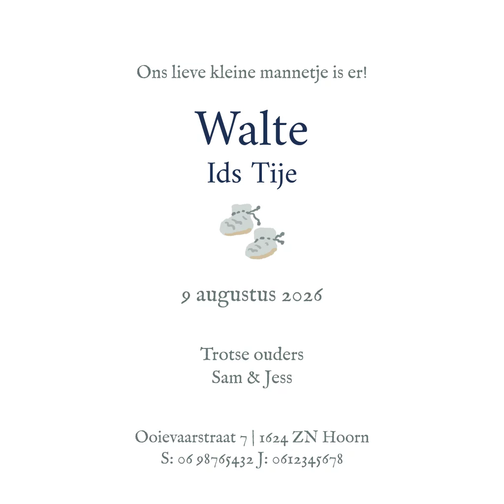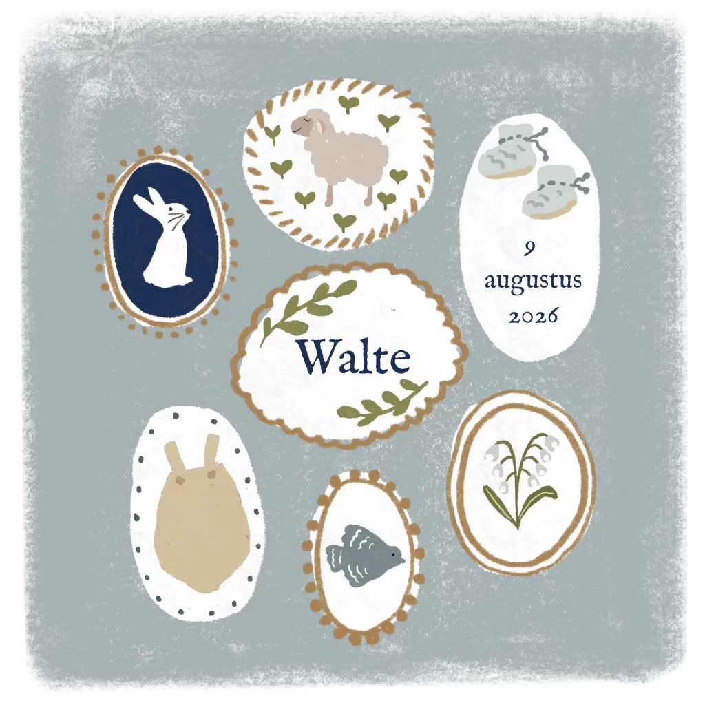 Stoer jongens geboortekaartje met dieren zoals een schaapje, konijntje en duifje en schattige babyspulletjes zoals de babyslofjes en een pakje. De achtergrondkleur van dit blauw grijze geboortekaartje kan naar wens worden aangepast. Bestel een proefdruk om dit kaartje in het echt te bewonderen.