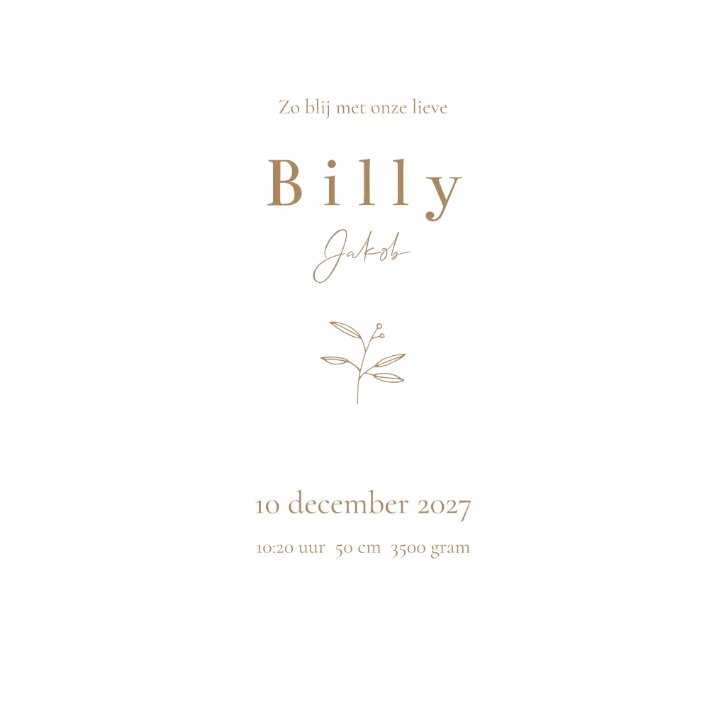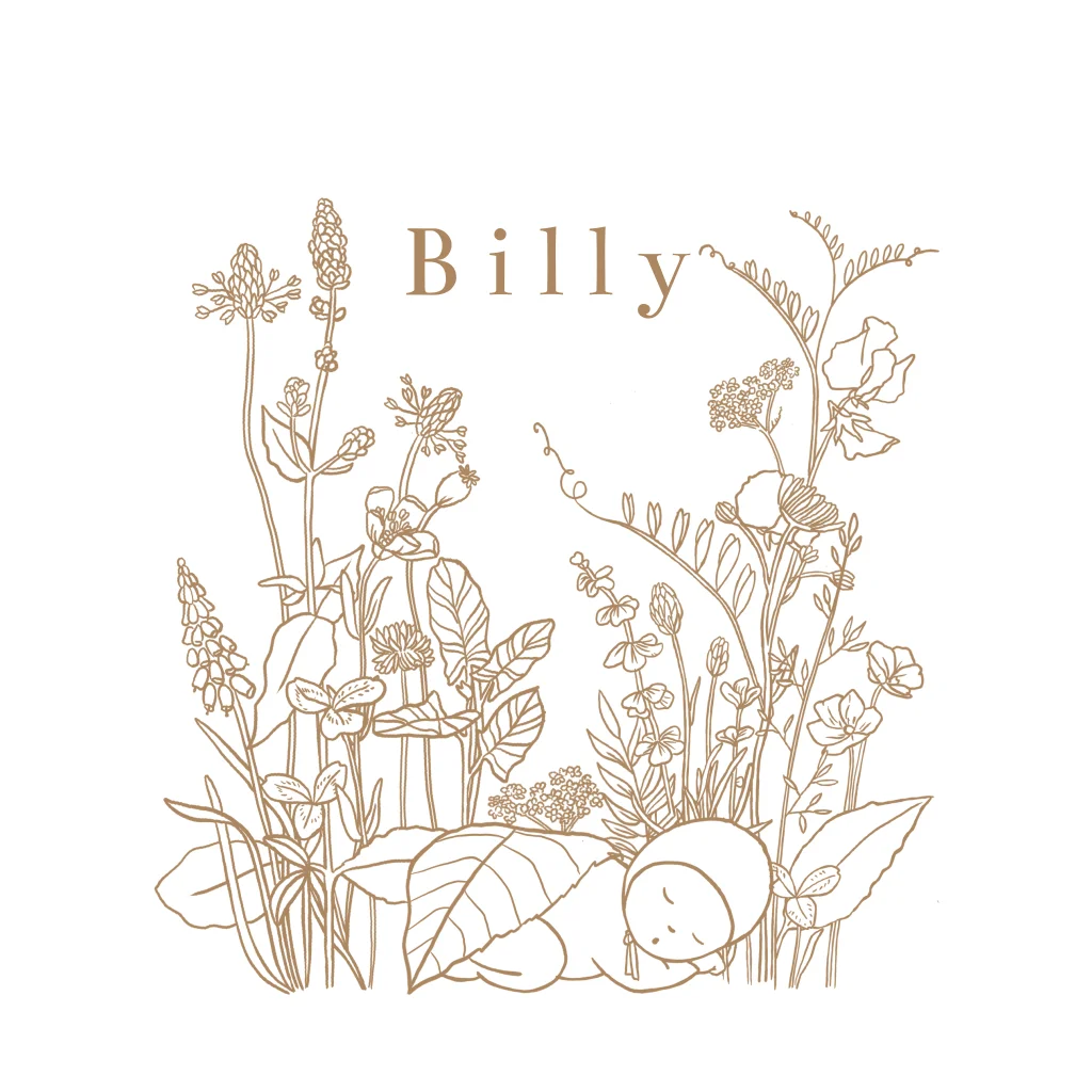 Een geboortekaartje met een slapende baby tussen de veldbloemen. De kleur van de illustratie van het kindje en de wilde bloemen is aanpasbaar.