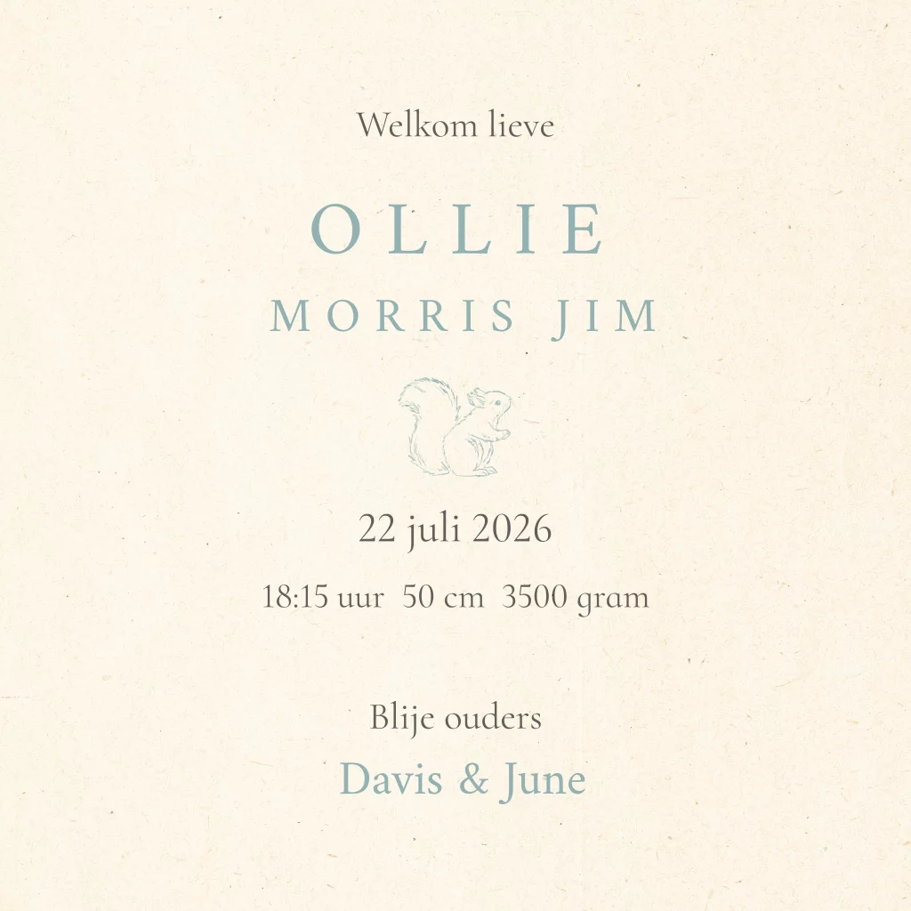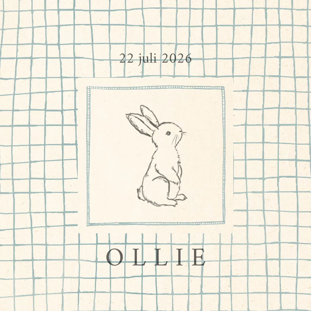Lief jongens geboortekaartje met een illustratie van een staand konijntje. Het dieren geboortekaartje heeft een blauw ruitjespatroon. Pas het het kaartje gemakkelijk in onze online editor aan en bestel een proefdruk van jouw unieke kaartje.