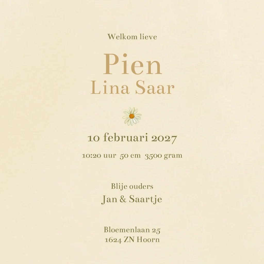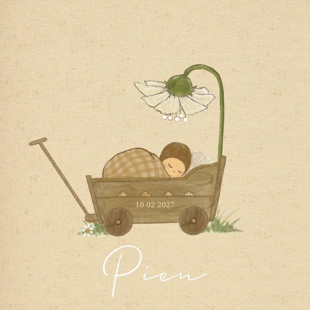 Een lief geboortekaartje met een dromerige illustratie van een slapende baby in een bolderkar, beschut onder een bloem in de natuur. De Zoetje illustratie is een tikje nostalgisch en tegelijkertijd heel hip.