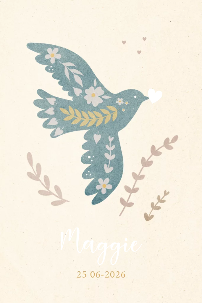 De illustratie van een vogel met een hartje in de snavel is een mooi symbool voor een nieuw lief kindje. Een heel lief geboortekaartje voor een meisje.