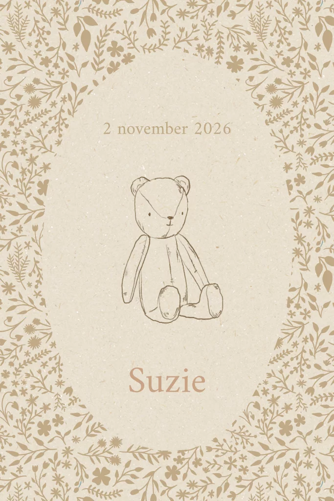 Een lief en rustig ontwerp met een handgetekende, minimalistische teddybeer in een ovale vorm met bloemen. Het kaartje in natuurlijke kleuren kan worden aangepast in de editor. Bestel een proefdruk om dit neutrale geboortekaartje met beertje in het echt te bewonderen.