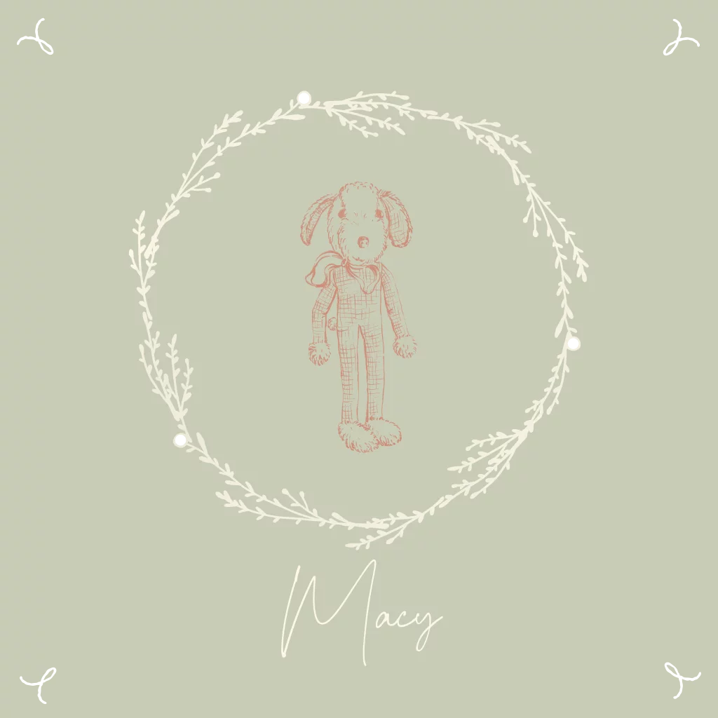 Een schattig meisjes geboortekaartje met knuffel hond in oud groen. Dit lieve dieren geboortekaartje met oud groene achtergrond heeft op de voorzijde en op de achterzijde details van goudfolie. Op de achterzijde staan schattige baby slofjes afgebeeld. Dit dieren geboortekaartje is volledig aanpasbaar waardoor je de mogelijkheid hebt om het kaartje naar wens te bewerken.