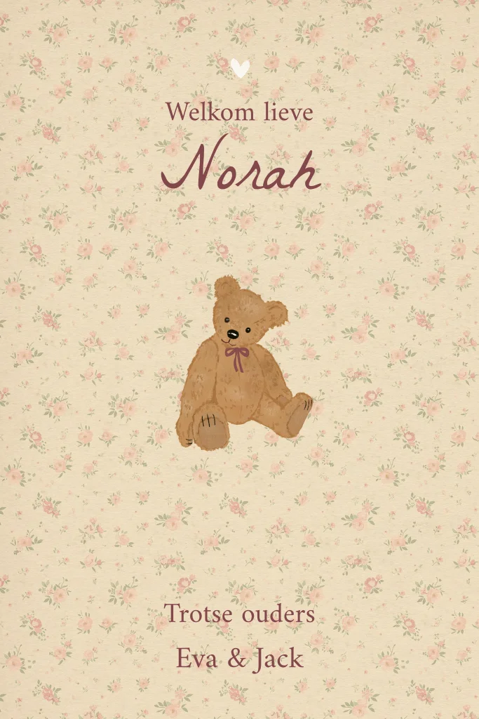 Een lief geboortekaartje voor een meisje met een illustratie van een teddybeer. Je kunt de kleuren en het lettertype zelf aanpassen naar wens. Ook is het mogelijk om de beer te vervangen door een ander dier. Het ovaal is er uit gestanst. Personaliseer dit nostalgische geboortekaartje voor jullie dochter in de editor en bestel een proefdruk om hem in het echt te zien. Wil je iets laten aanpassen - Zoetje helpt je graag.