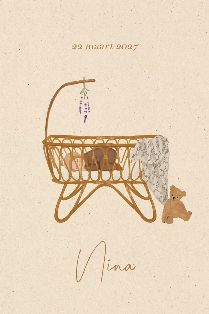 Dit lieve geboortekaartje met een slapend kindje in een rotan wiegje is geschikt voor zowel een jongen als een meisje. Het bosje lavendel boven het wiegje voegt een lieve, natuurlijke touch toe. Details zoals het dekentje en het beertje kunnen eenvoudig worden aangepast door elementen uit de beeldbank toe te voegen, zodat je het kaartje helemaal naar jouw wens kunt personaliseren. Wil je de illustratie laten aanpassen, of een andere vorm kaartje? Stuur gerust een mailtje.