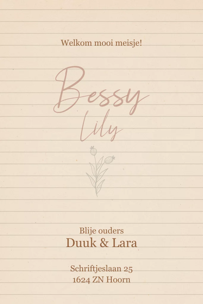 Een ouderwets schoolschriftje als meisjes geboortekaartje! Op de voorzijde van dit retro geboortekaartje voor jullie dochter in oudroze vind je een ouderwets etiket met in handgeschreven lettertype de naam van jullie meisje. Aan de binnenzijde een lijntjespapiertje en afbeelding van een schattig bloemetje. Een hip en bijzonder meisjes geboortekaartje met een nostalgisch tintje. Wil je iets aanpassen, maar kom je er niet uit? Zoetje helpt heel graag. Bestel een proefdruk om dit vintage geboortekaartje voor een dochter in het echt te zien.