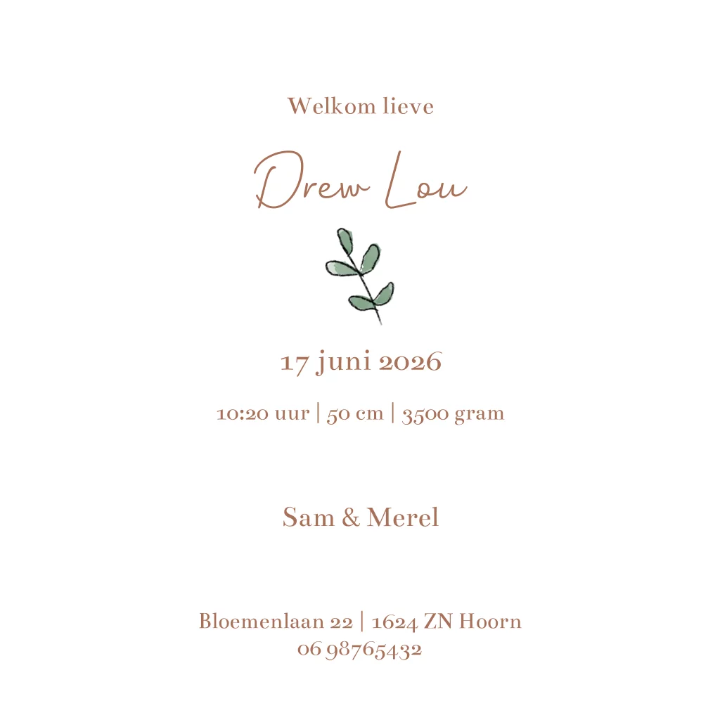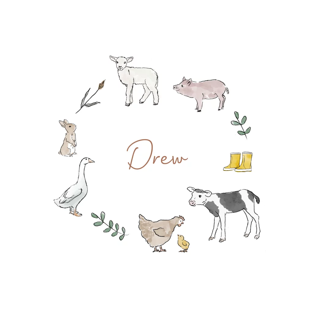 Een vrolijk en lief geboortekaartje voor jouw kindje. Het kaartje heeft een vierkant formaat. Op het kaartje zie je een illustratie van boerderijdieren, zoals een gansje, een konijn, een koe en een biggetje. Pas het ontwerp naar wens aan in de online editor. Zoetje helpt je graag.