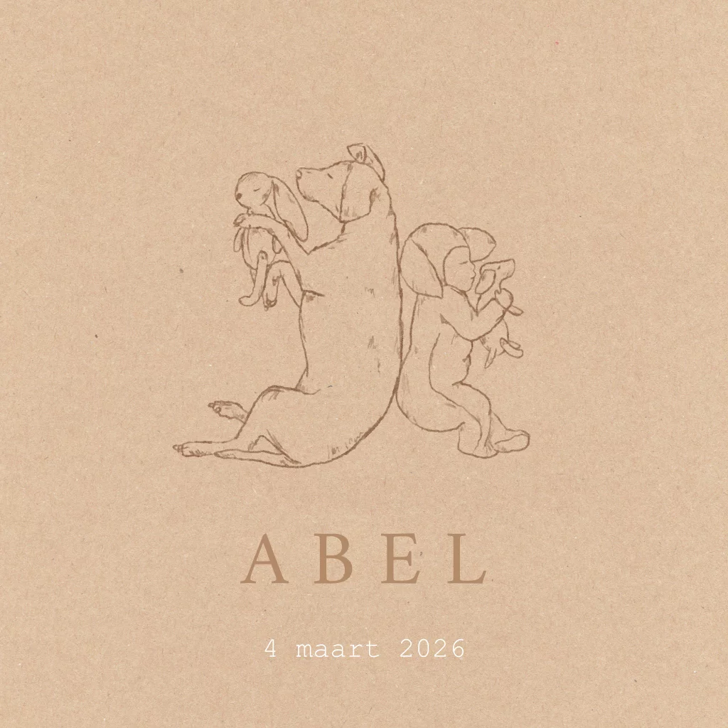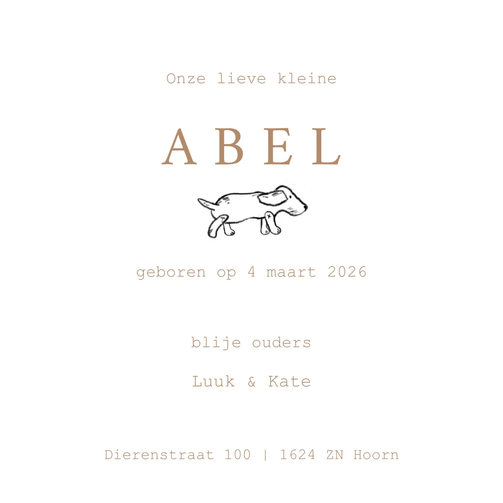 Een vierkant dieren geboortekaartje voor een jongen of een meisje met een lieve tekening van een kindje samen met een hond. Allebei slapen ze heel schattig met een knuffel. Bestel een proefdruk om dit kaartje in het echt te bekijken.