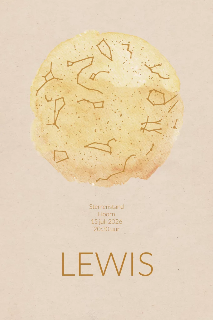 Een zacht mooi kaartje met een unieke sterrenstand op basis van de geboortedatum, geboorteplaats en geboortetijd. Pas jouw kaartje naar wens aan. Na de geboorte hoef je alleen een mailtje te sturen en Zoetje plaatst de unieke sterrenhemel in jullie kaartje. Vragen? Zoetje kijkt graag met je mee.