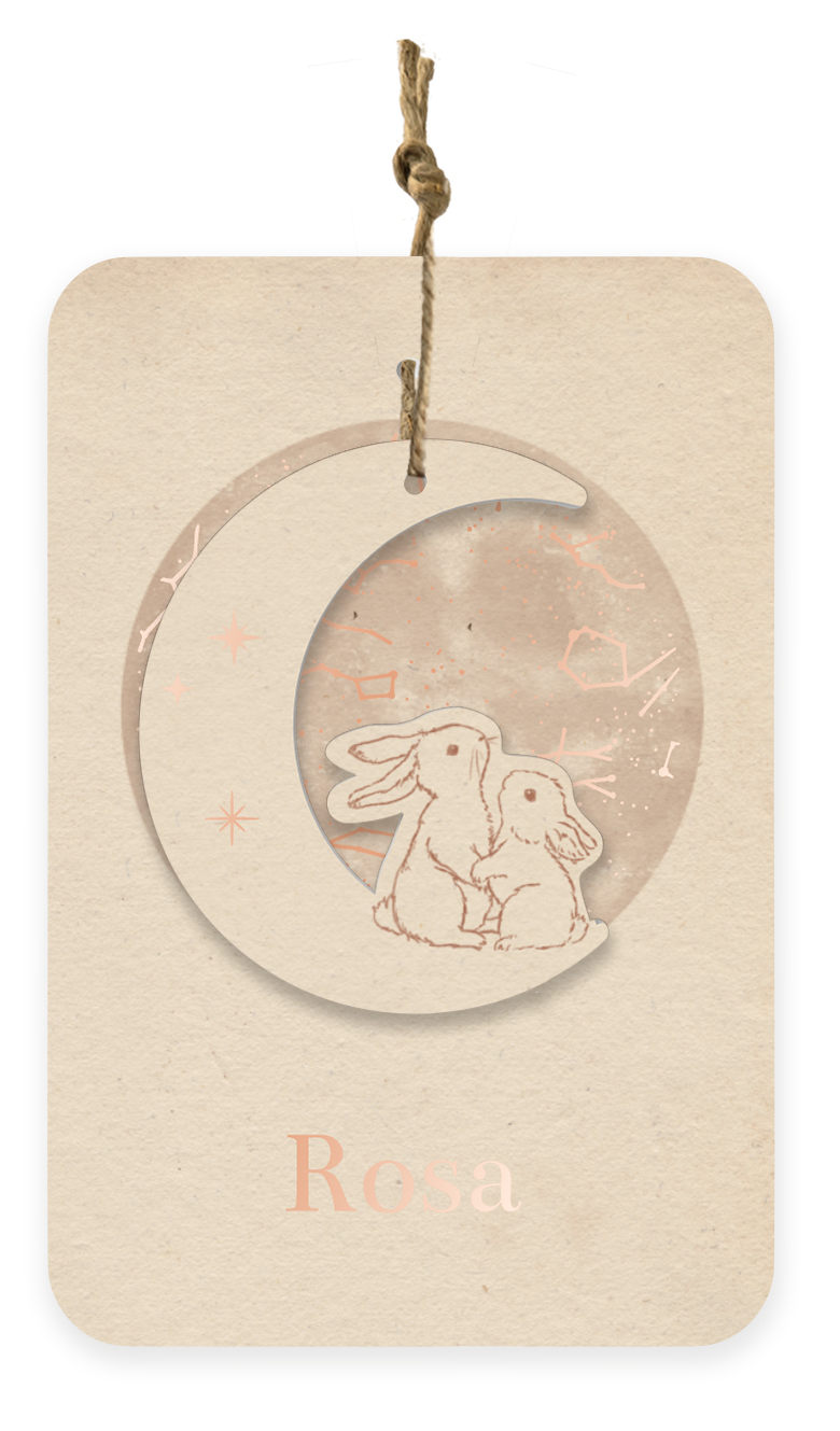 Lief geboortekaartje met de stand van de sterren op het moment van de geboorte, gecombineerd met een label in vorm van de maan met konijntjes. De unieke sterrenhemel op basis van de geboortedatum, geboorteplaats en geboortetijd en het originele label maken dit geboortekaartje heel bijzonder en persoonlijk. De twee konijntjes op de maan maken dit kaartje heel geschikt voor een grote broer of grote zus. Pas jouw geboortekaartje naar wens aan en Zoetje plaatst na de geboorte jullie unieke sterrenhemel in het kaartje. Voor vragen of aanpassingen stuur gerust een mailtje. Bestel een proefdruk om dit label geboortekaartje in het echt te zien.