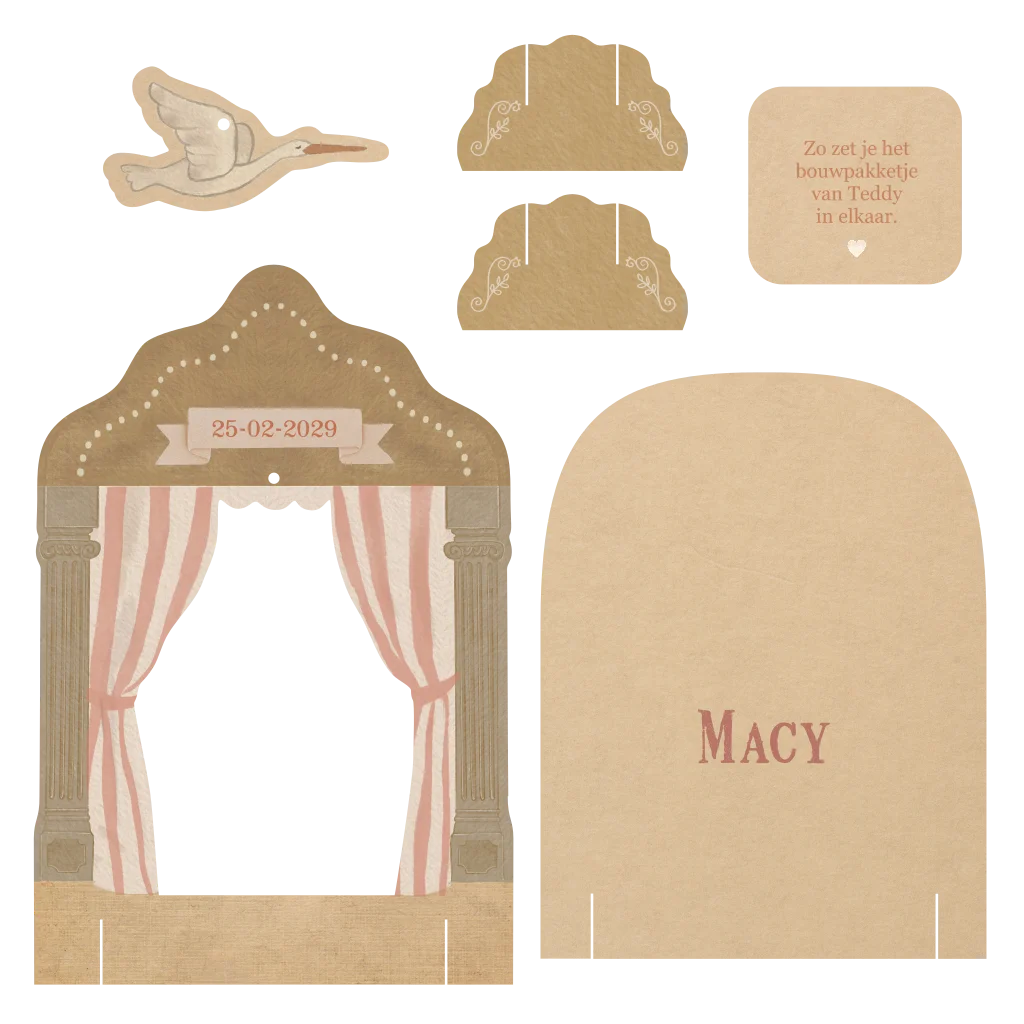 Je ontvangt een set losse onderdelen die eenvoudig in elkaar te zetten zijn. De voorkant vormt een theater, met het geboortekaartje als achtergronddecor. Boven het toneel vliegt een ooievaar, die je bevestigt met een touwtje.
