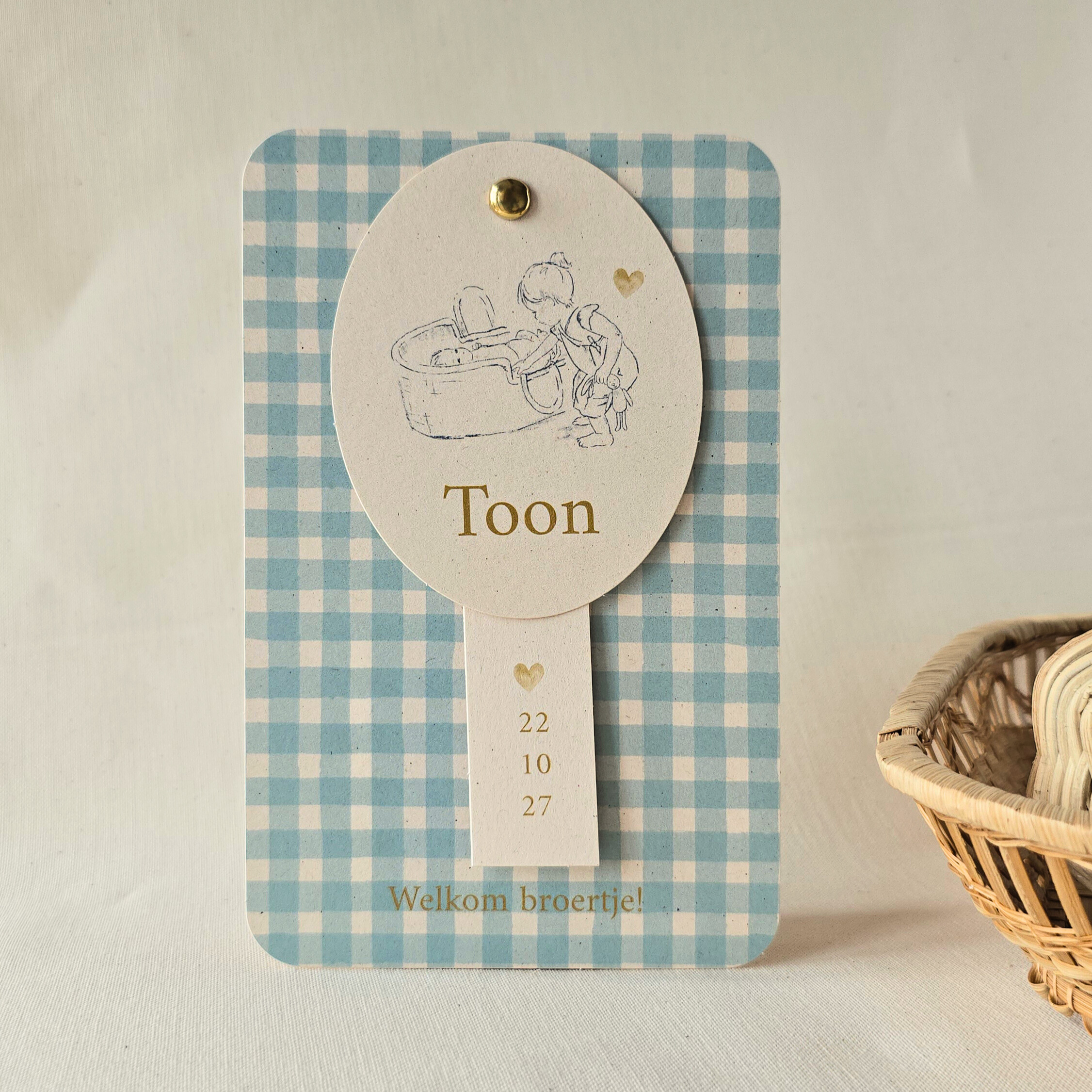 Een schattig geboortekaartje voor een zoon met petrol ruitjes achtergrond. Bij dit geboortekaartje horen twee labels. Op het ene label staat een illustratie afgebeeld van een grote zus met een baby broertje in een mandje. Deze kun je ook wijzigen. Wil je broertjes of zusjes laten toevoegen - Zoetje past graag de illustratie voor je aan. Op het andere label staat de geboortedatum. Bevestig de labels aan het kaartje met een spiltpen of touwtje.