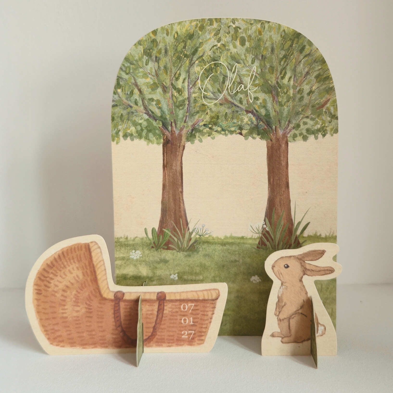 Dit originele geboortekaartje wordt geleverd als een setje losse onderdelen die eenvoudig in elkaar te zetten zijn. Op de achtergrond staat een sfeervolle Zoetje illustratie van bomen, bloemen in natuurtinten. Daarvoor plaats je het babymandje en een lief konijntje – beiden staand in een houdertje in de vorm van een haagje.