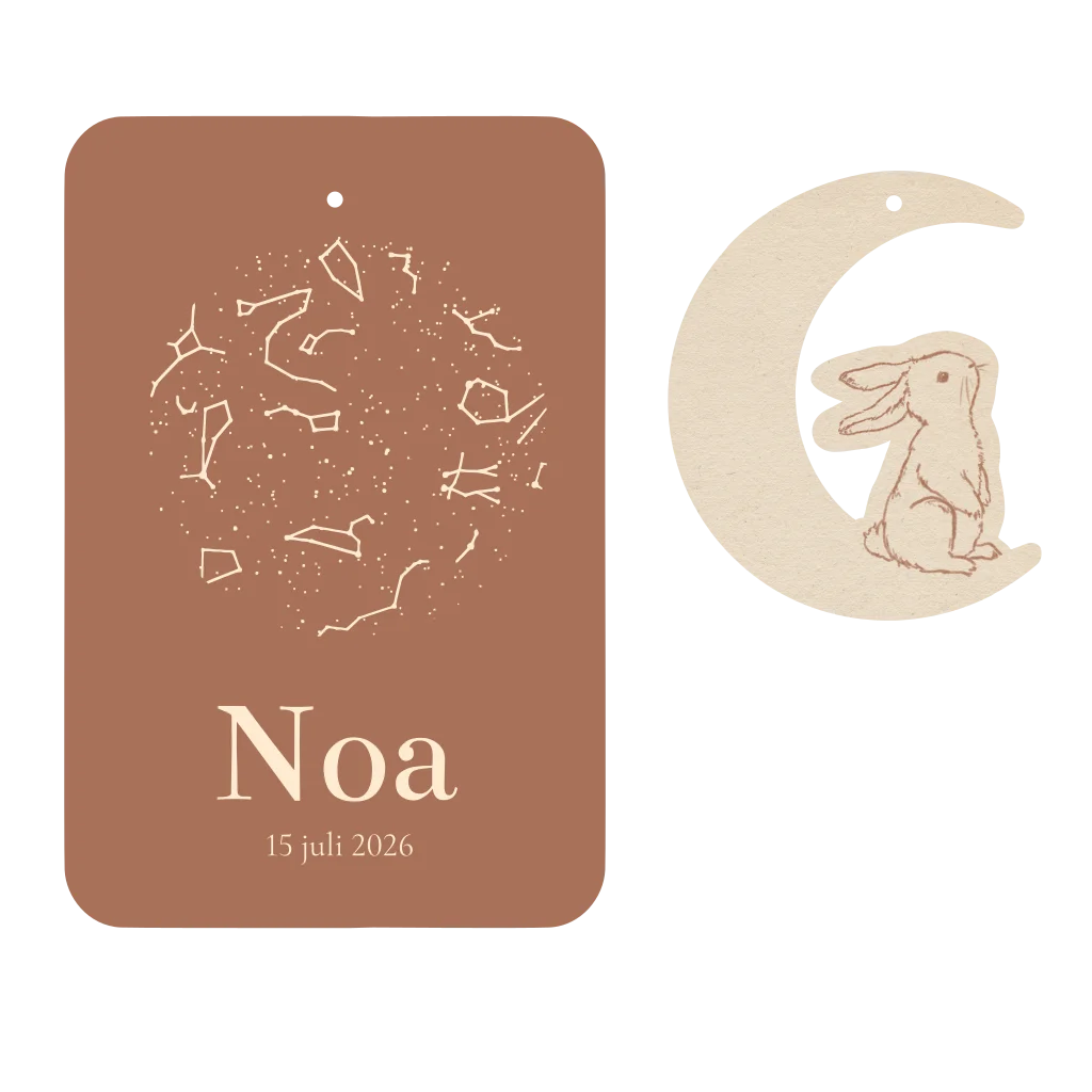 Lief label geboortekaartje met de stand van de sterren op het moment van de geboorte, gecombineerd met een label in vorm van de maan met een konijntje. De unieke sterrenhemel op basis van de geboortedatum, geboorteplaats en geboortetijd en het originele label maken dit geboortekaartje heel bijzonder en persoonlijk.