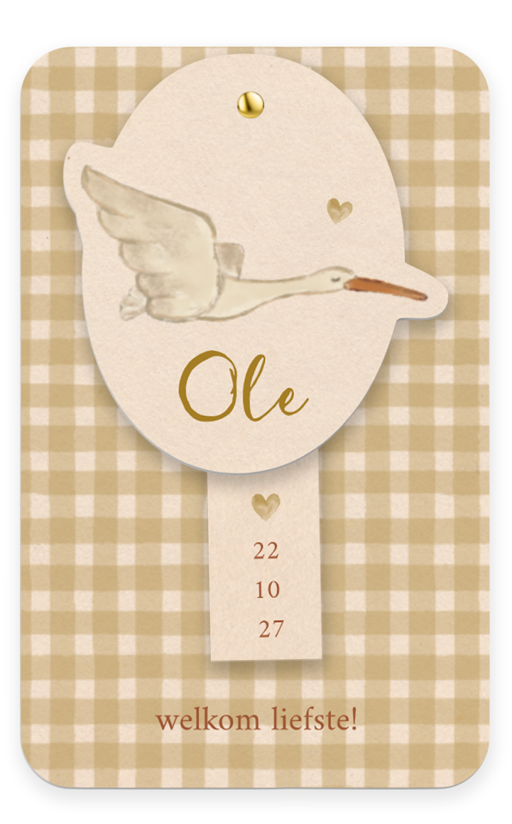 Een schattig geboortekaartje voor jullie zoon met okergele ruitjes achtergrond. Bij dit geboortekaartje horen twee labels. Op het ene label staat een ooievaar afgebeeld, samen met de naam van jullie zoon en op het andere label staat de geboortedatum. Bekijk ook alle andere kaartjes met dieren. Bestel snel een proefdruk en bewonder dit lieve kaartje in het echt!