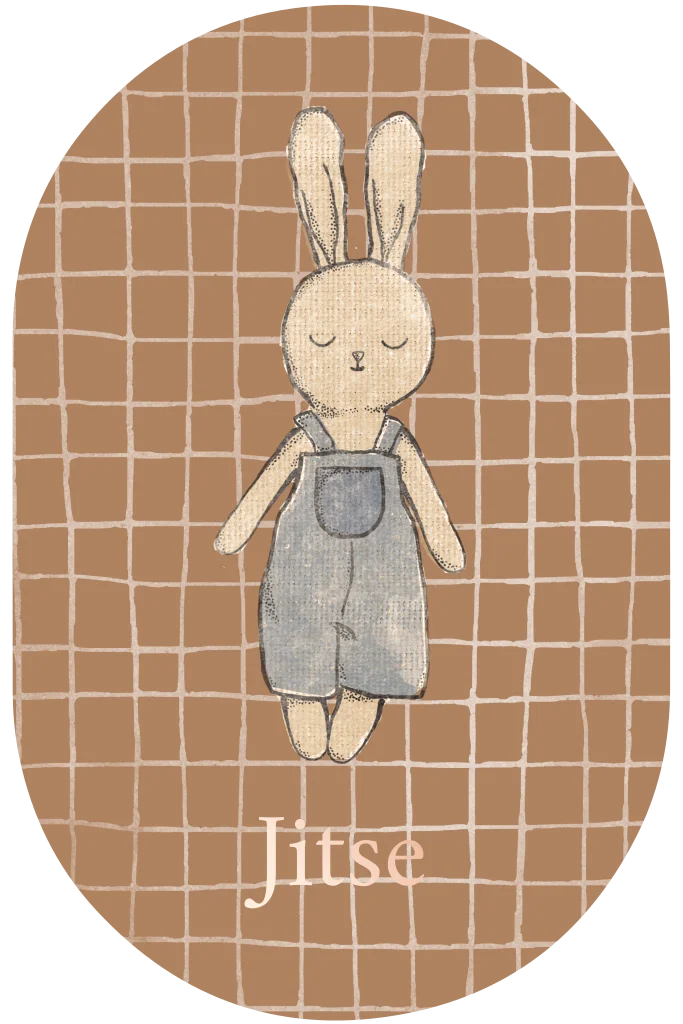 Hip jongens geboortekaartje met een tekening van een knuffel konijntje is extra bijzonder door de ovale vorm. De bruine kleur en de ruitjes op de achtergrond geven dit kaartje een retro uitstraling. De ruitjes kunnen ook vervangen worden door een andere achtergrond. De naam in foliedruk geeft dit kaartje net dat beetje extra. Pas dit jongens geboortekaartje naar wens aan en bestel een proefdruk om hem in het echt te zien.