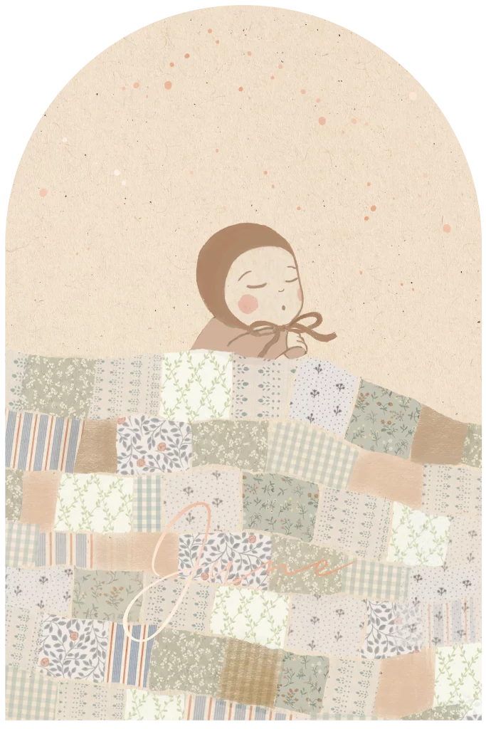 Een lieve illustratie van een slapende baby onder een lappendekentje. Ontzettend schattig met de stipjes en de naam in roségoud folie. De stansvorm maakt het kaartje helemaal uniek. Wil je liever een andere vorm, of iets in de illustratie laten aanpassen? Laat het Zoetje even weten.