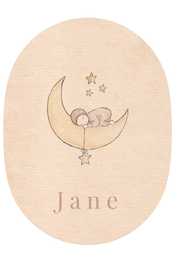 Een prachtig getekend geboortekaartje van een klein kindje slapend op de maan omringd door sterretjes. De beige structuur op de achtergrond zorgt ervoor dat het kaartje een warme, nostalgische uitstraling krijgt. Dit lieve geboortekaartje voor jullie zoon of dochter is naar wens aan te passen in de online editor. Bestel een proefdruk om dit schattige geboortekaartje in het echt te zien.