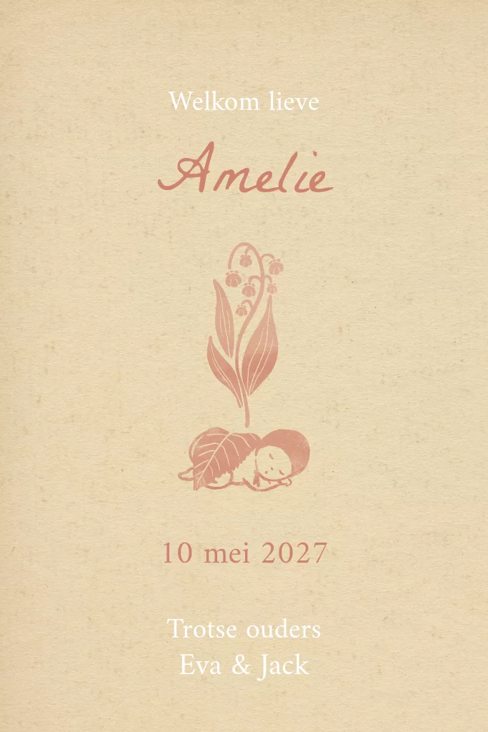 Prachtig en uniek doorkijk geboortekaartje voor meisjes met geboortebloem en bloemenkindje. Dit romantische bloemen geboortekaartje heeft een doorkijkje waarachter je de geboortebloem van de maand waarin jullie kindje wordt geboren kunt plaatsen, zoals dit lieve lelietje-van-dalen die symbool staat voor de maand mei. Personaliseer dit lieve geboortekaartje voor jullie dochter in de editor en bestel een proefdruk om hem in het echt te zien.