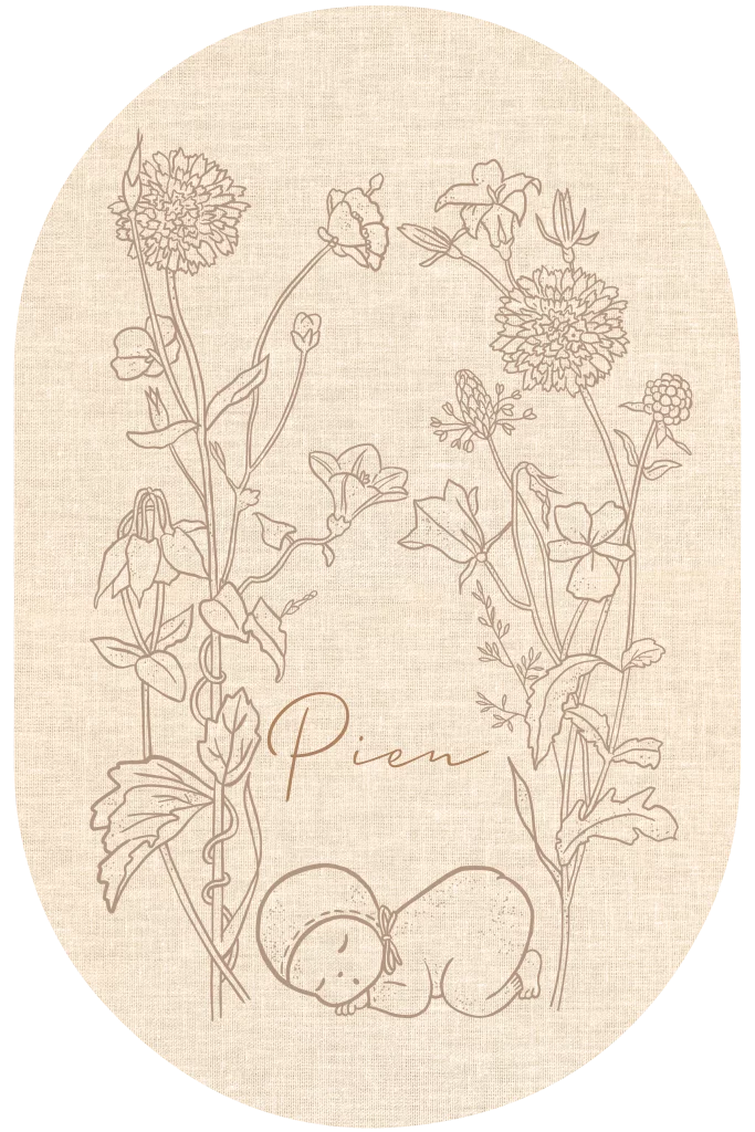 Ovaal geboortekaartje met een schattige illustratie van een slapend kindje in de natuur onder de bloemen. Perfect voor zowel een meisje als een jongen. De linnenlook-achtergrond geeft het kaartje een warme, nostalgische uitstraling. Met goudfolie krijgt het een extra luxe afwerking. Bestel een proefkaartje en bewonder het zelf in het echt!