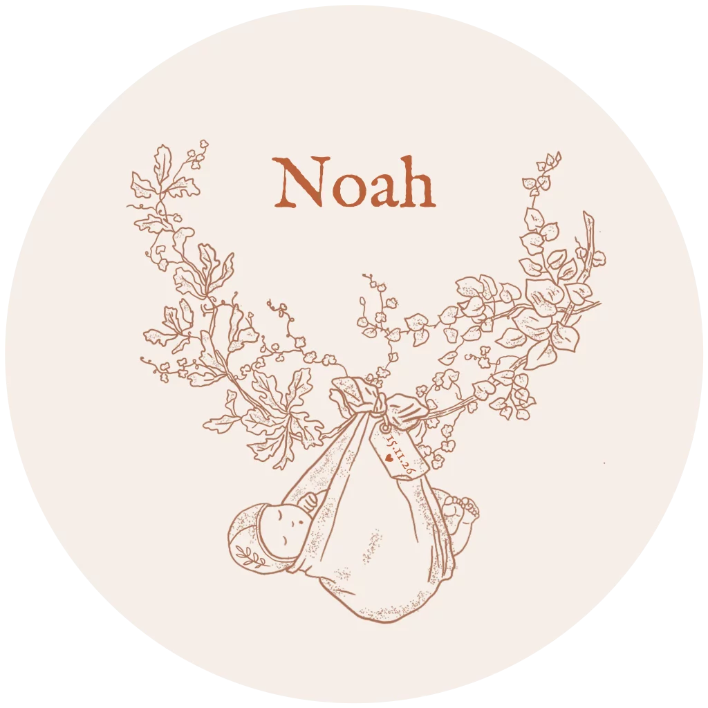 Een unieke illustratie van een slapend kindje in een doek met tak van bloemen in roestbruin. Aan het doek waar het slapende kindje in ligt, hangt een labeltje. Het is mogelijk om hier de geboortedatum te plaatsen. Dit unisex geboortekaartje is heel mooi voor een jongen en een meisje. Pas het kaartje aan naar wens en bestel een proefdruk om hem in het echt te bewonderen.