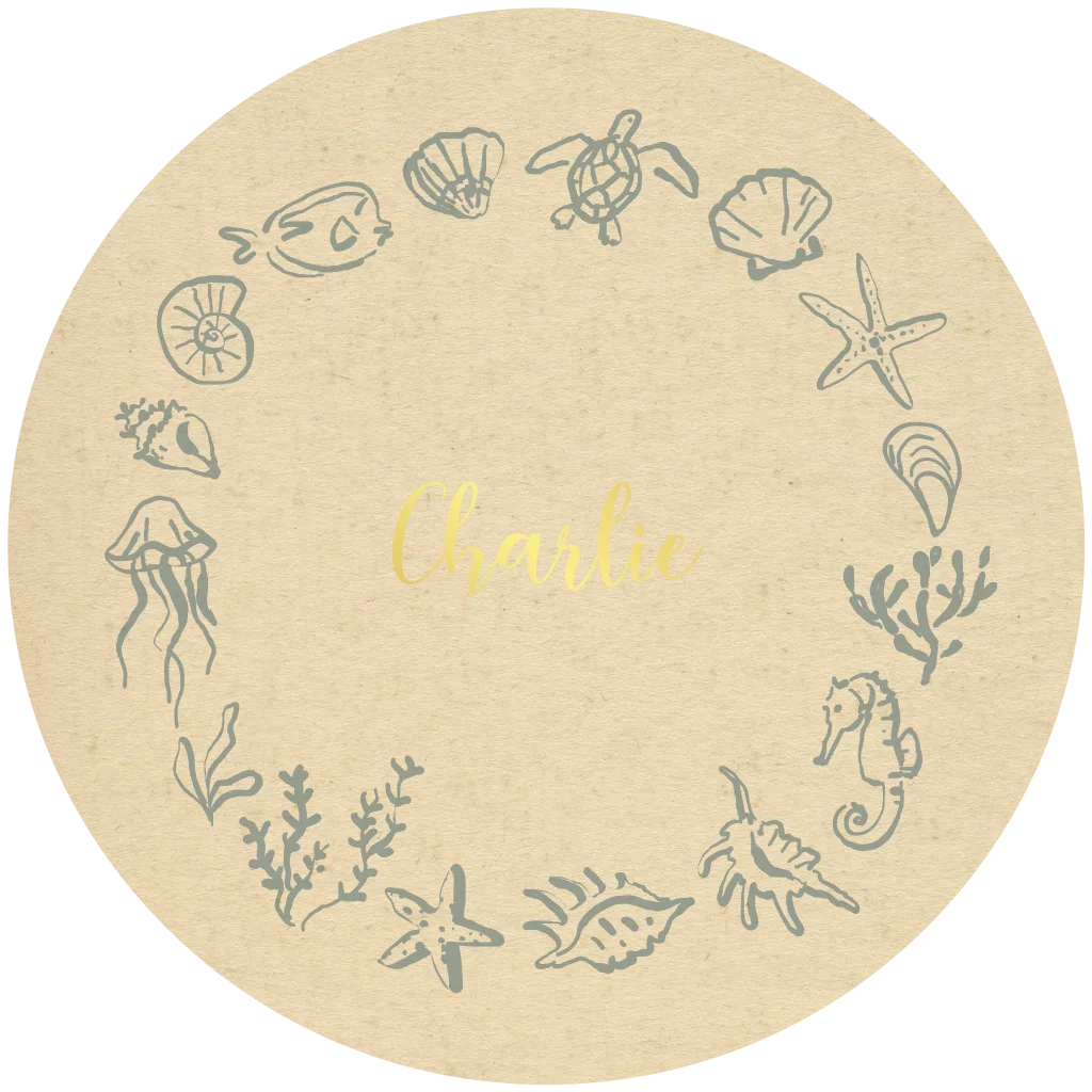 Ronde vorm geboortekaartje met zeedieren, zoals een zeepaardje, vissen en een schildpad. De naam in goudfolie geeft dit geboortekaartje voor jullie zoon net dat beetje extra en kan ook aangepast worden in een andere kleur foliedruk. Pas het ontwerp naar wens aan en bestel een proefdruk om het kaartje in het echt te bewonderen.