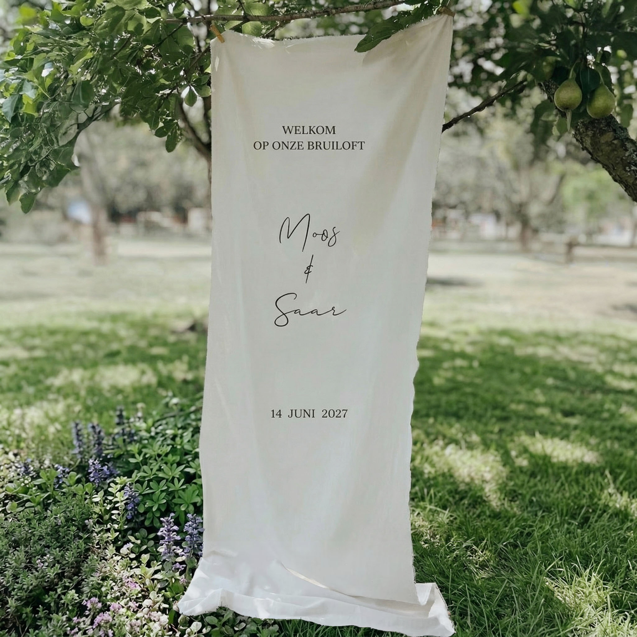 Verwelkom jullie gasten op een stijlvolle manier met deze banner van ongebleekt katoen. Perfect als welkomstbord of als decoratie, zowel binnen als buiten in de tuin tijdens jullie bruiloft.