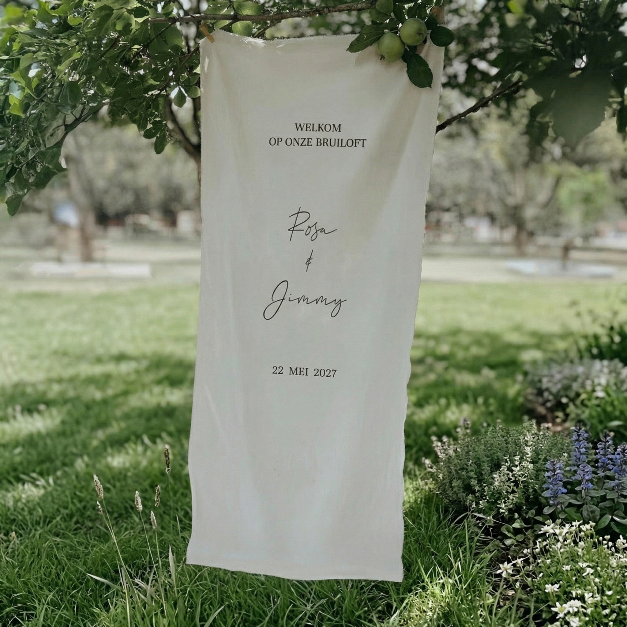 Verwelkom jullie gasten op een stijlvolle manier met deze banner van ongebleekt katoen. Perfect als welkomstbord of als decoratie, zowel binnen als buiten in de tuin tijdens jullie bruiloft. De stof heeft ruwe, ongezoomde randen die zorgen voor een natuurlijke uitstraling en prachtig passen bij iedere stijl bruiloft.